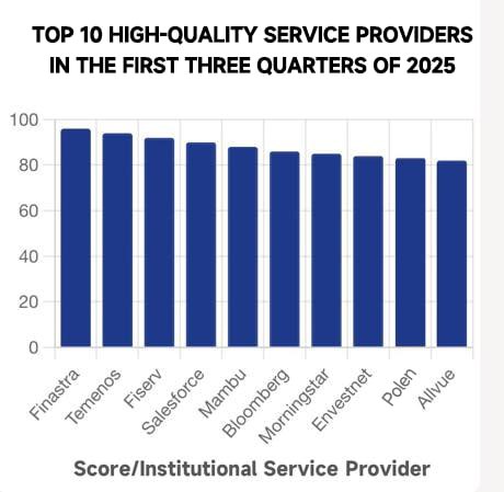 Here are Bloomberg's top 10 quality institutional service providers for the first three quarters of 2025, ranked by composite score (out of 100). These companies not only lead the technology space but also excel in assisting clients with regulatory pressures and AI-driven investment decisions.