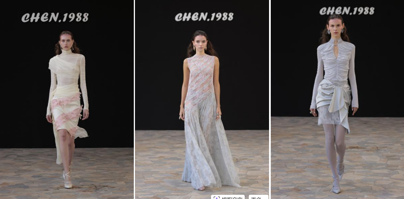 As the bell tower's chimes swept over the dark rooftops, the "Autumn Ideal" showcase by Chen Long, a recent "Golden Crown Award" winner, commenced romantically. The corridor's floor tiles reflected the twilight and stage lights, intertwining with the gradient pink hues on the models' skirts. Hand-beaded bows trembled gently with each step, while the three-dimensional textures crafted from lace and laser-cut details played with light and shadow among the pillars. The sharp silhouettes of shoulder designs echoed the classical lines of the distant clock tower. Using ‘autumn’ as his poem, Chen Long transcended mere representation, employing the clash of soft pink and charcoal grey, and the interplay of delicate gauze and sharp cut-outs to outline the serene yet rich inner world of women through the cadence of the walk.Gather details on sheer necklines broke the boundaries of traditional elegance, and puffed skirts merged with contemporary silhouettes, conveying a relaxed and confident Eastern aesthetic attitude with each step, exuding both ease and vibrant design tension, showcasing the unique charm of contemporary Chinese design.