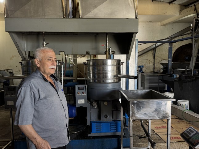 He greets us at the gate of his olive mill as his eyes linger on the now idle presses.
